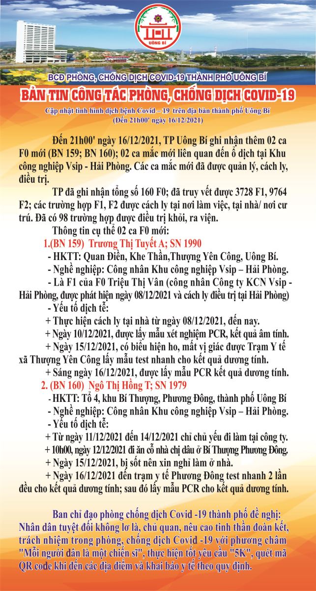 Cập nhật tình hình dịch bệnh Covid-19 trên địa bàn thành phố Uông Bí (đến 21h00' ngày 16/12/2021)