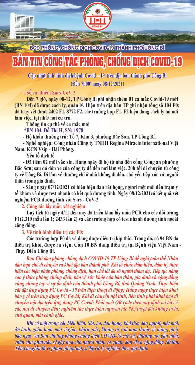 Cập nhật tình hình dịch bệnh Covid-19 trên địa bàn thành phố Uông Bí (đến 7h00' ngày 08/12/2021)