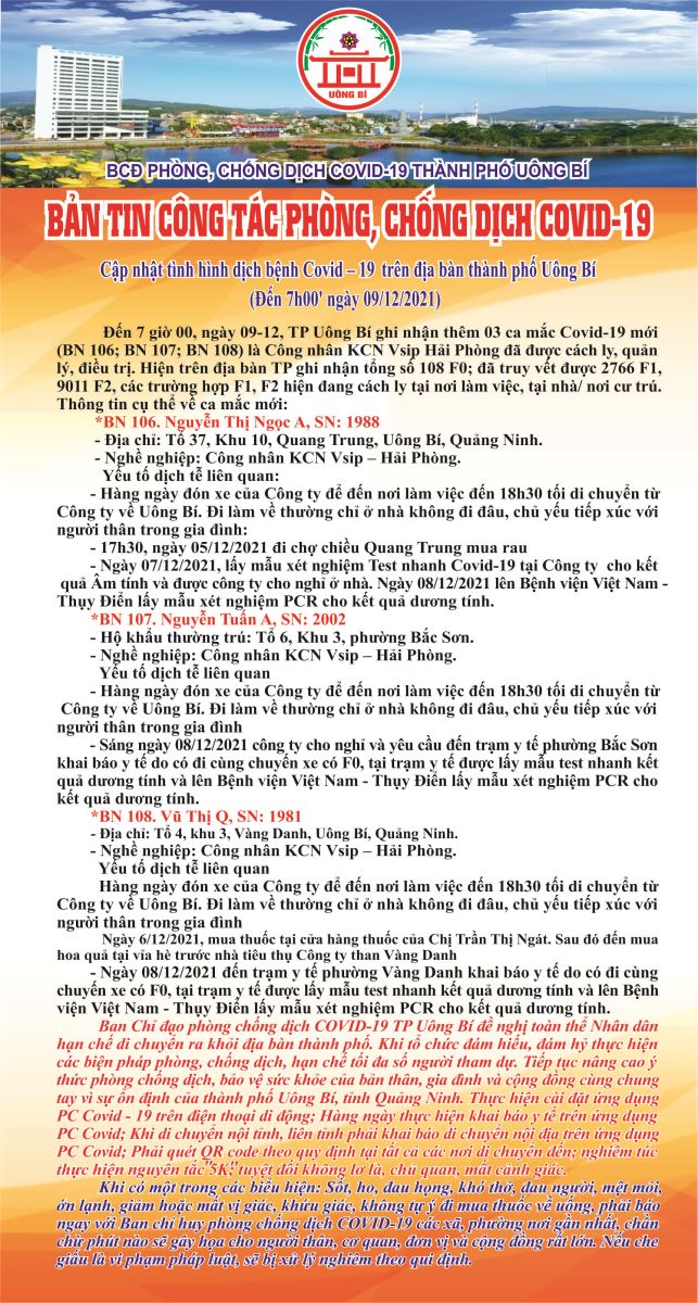 Cập nhật tình hình dịch bệnh Covid-19 trên địa bàn thành phố Uông Bí (đến 7h00' ngày 09/12/2021)
