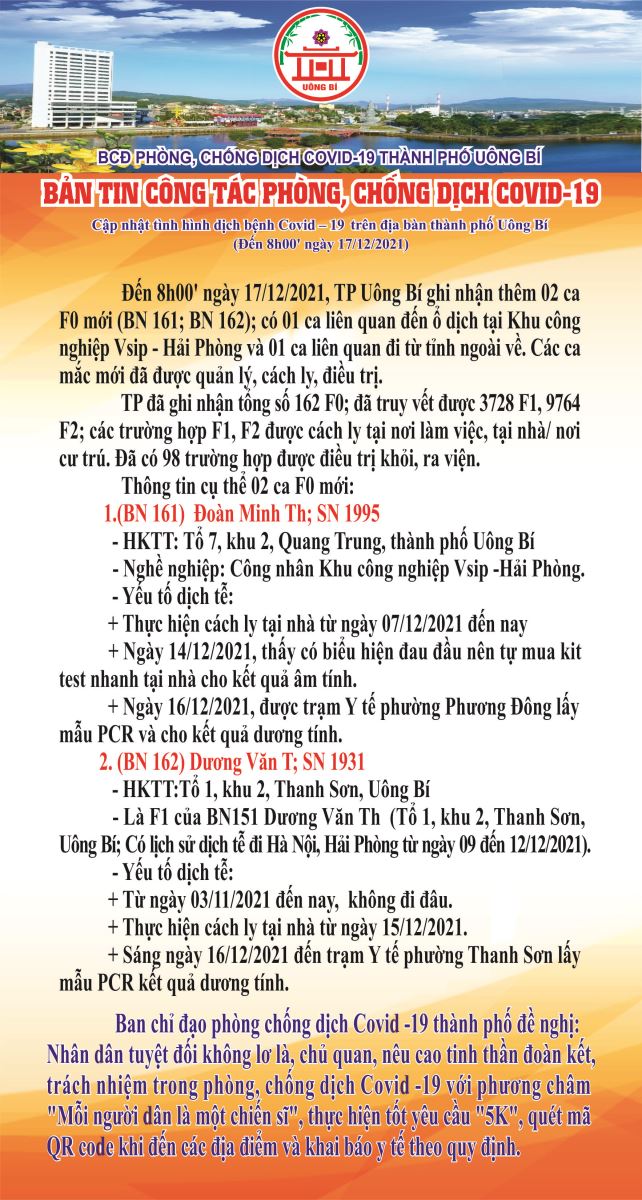 Cập nhật tình hình dịch bệnh Covid-19 trên địa bàn thành phố Uông Bí (đến 8h00' ngày 17/12/2021)