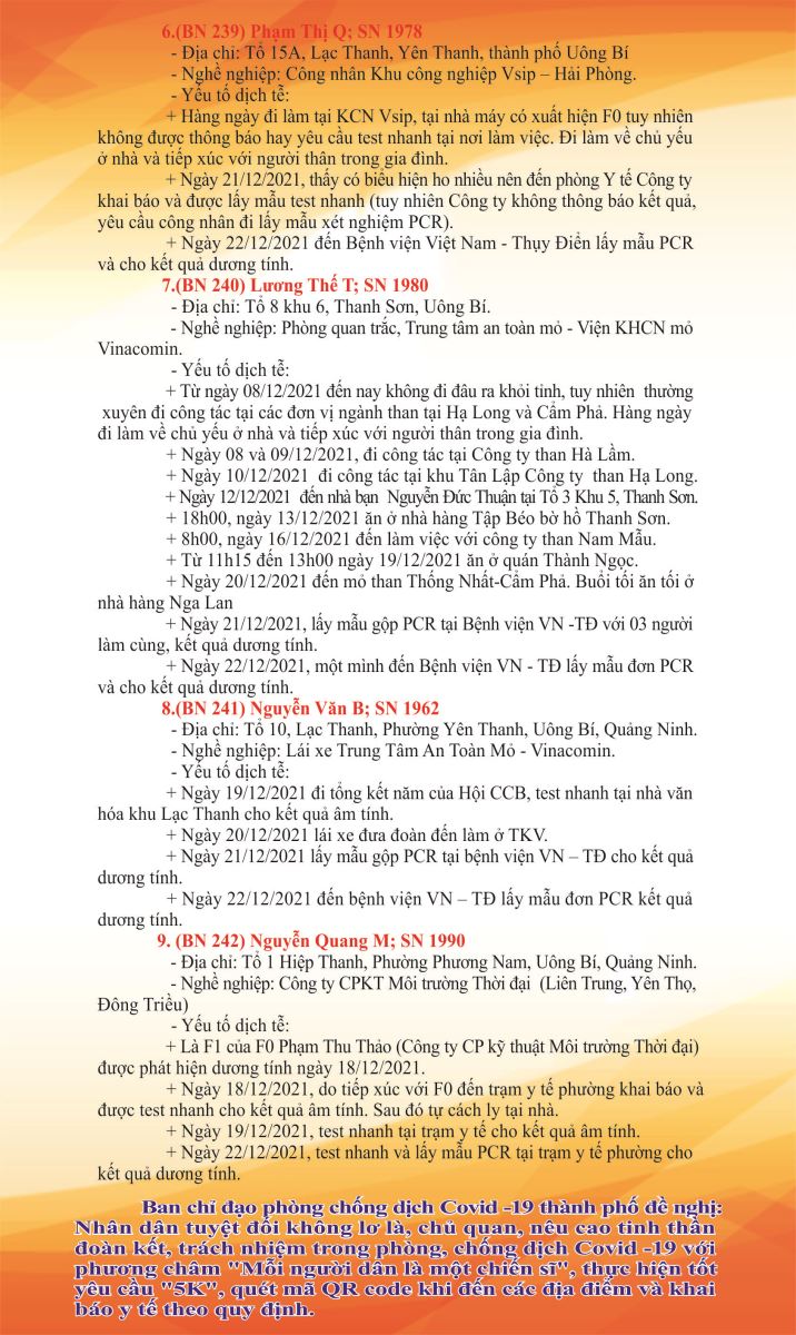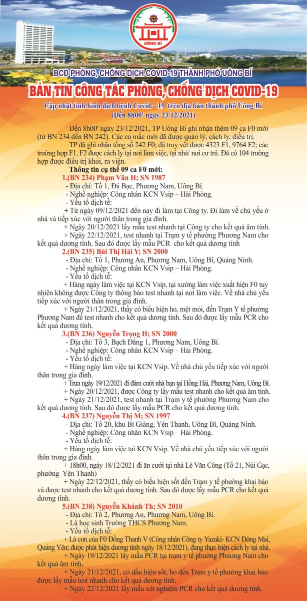 Cập nhật tình hình dịch bệnh Covid-19 trên địa bàn thành phố Uông Bí (đến 8h00 ngày 23/12/2021)