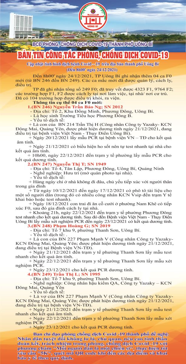 Cập nhật tình hình dịch bệnh Covid-19 trên địa bàn thành phố Uông Bí (đến 8h00 ngày 24/12/2021)
