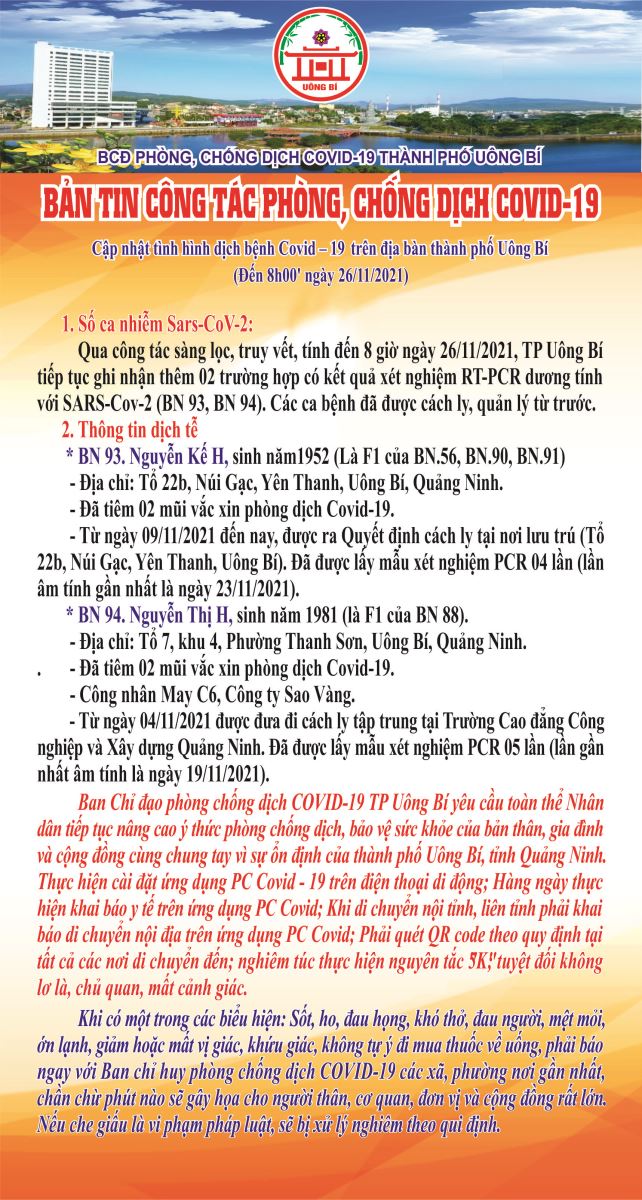 Cập nhật tình hình dịch bệnh Covid-19 trên địa bàn thành phố Uông Bí (Đến 8h00' ngày 26/11/2021)