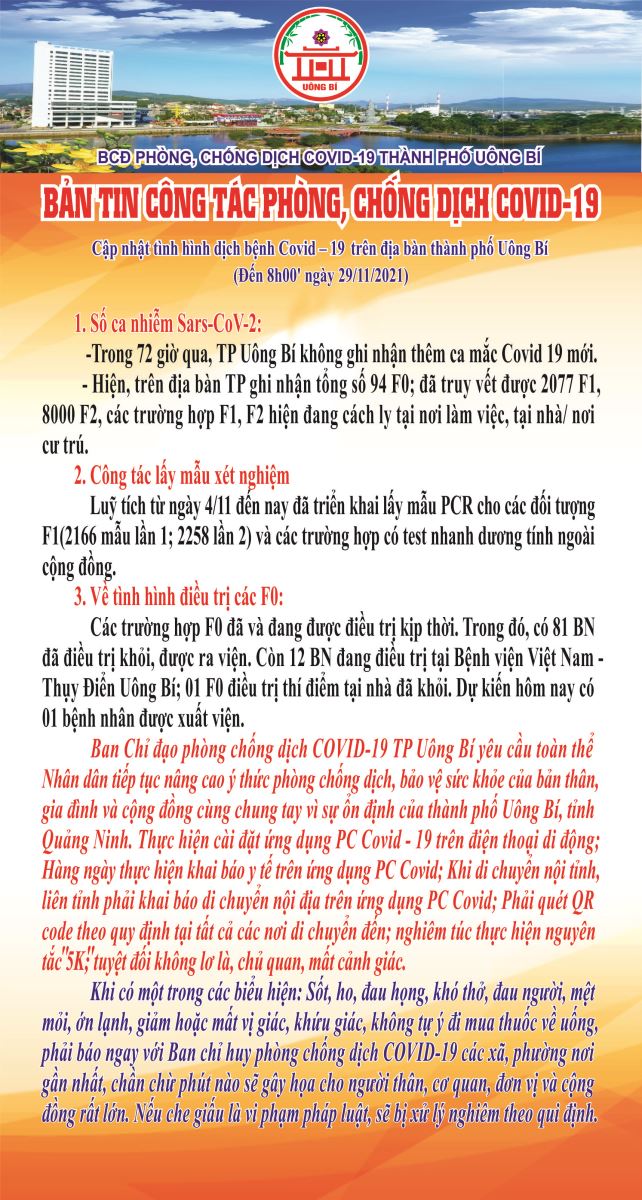 Cập nhật tình hình dịch bệnh Covid-19 trên địa bàn thành phố Uông Bí (Đến 8h00' ngày 29/11/2021)