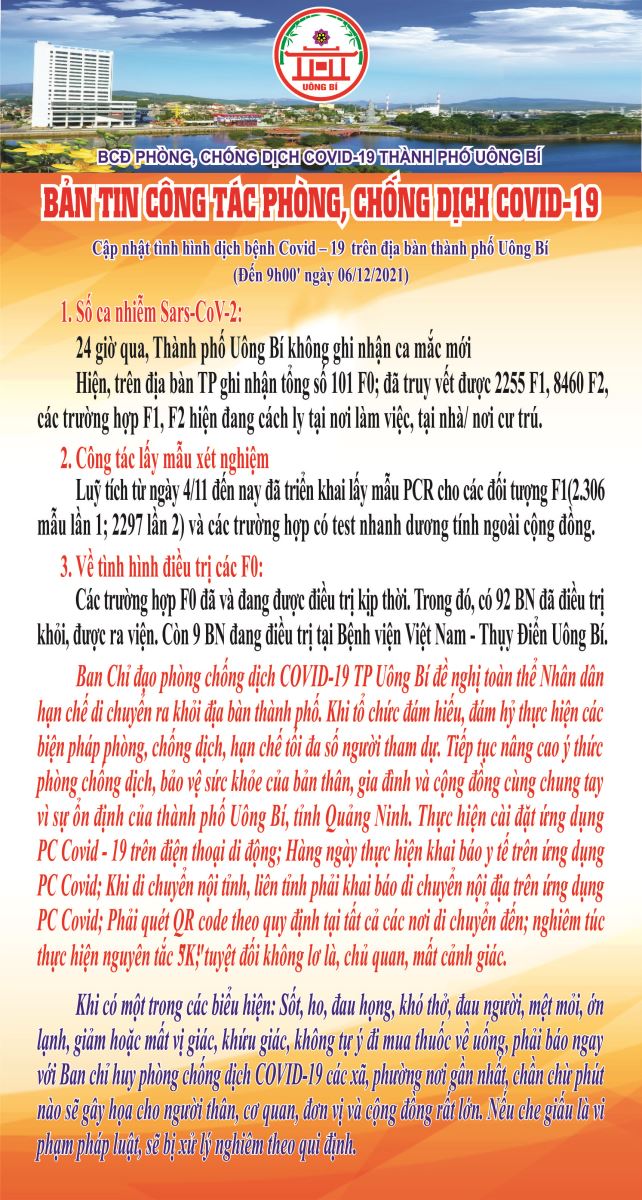Cập nhật tình hình dịch bệnh Covid-19 trên địa bàn thành phố Uông Bí (đến 9h00' ngày 06/12/2021)