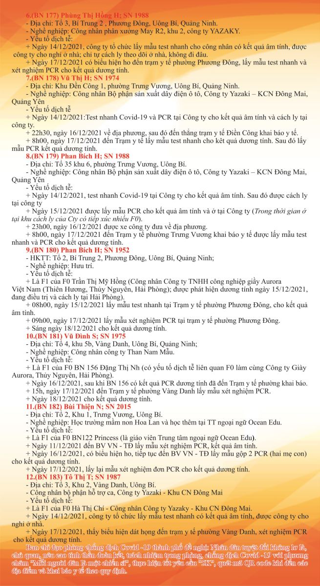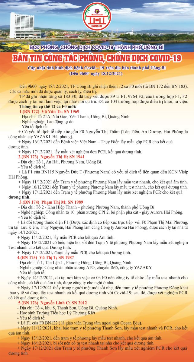 Cập nhật tình hình dịch bệnh Covid-19 trên địa bàn thành phố Uông Bí (đến 9h00' ngày 18/12/2021)
