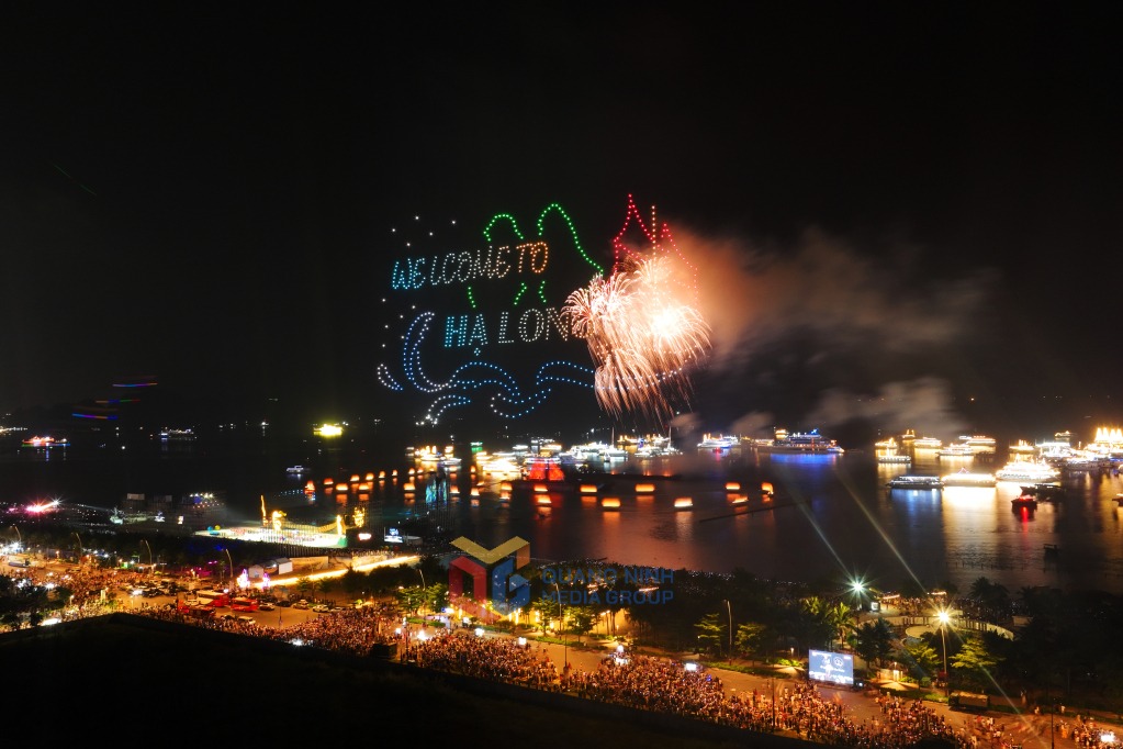 Carnaval Hạ Long 2025 sẽ sử dụng nghệ thuật hiện đại và công nghệ tiên tiến nhất hiện nay: 3D mapping, laser. (Trong ảnh: Năm 2024, Carnaval Hạ Long đã trình diễn Drone light - máy bay không người lái, xếp hình bằng hệ thống đèn màu để khắc họa những biểu tượng đặc trưng của Hạ Long – Quảng Ninh). Ảnh: Đỗ Phương
