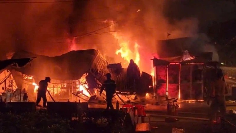 Theo thông tin ban đầu, ngọn lửa bùng lên từ cửa hàng đồ nhựa, sau đó lan nhanh sang các sạp hàng khác tạo thành một đám cháy lớn.