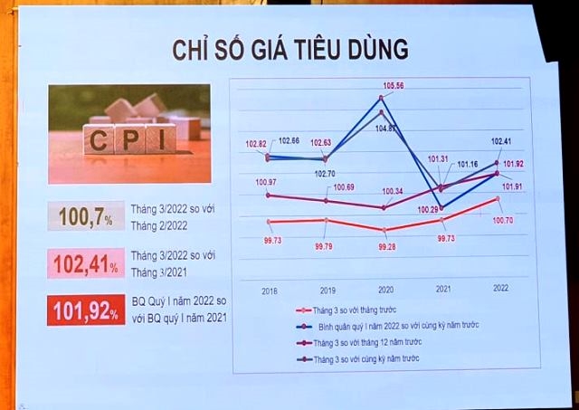 Tại Họp báo, Tổng cục trưởng Tổng cục Thống kê, bà Nguyễn Thị Hương cho biết: Giá xăng dầu, giá gas tăng theo giá nhiên liệu thế giới; giá nhà ở thuê tăng trở lại sau khi dịch COVID-19 được kiểm soát. Giá hàng hóa và dịch vụ tiêu dùng thiết yếu tăng theo giá nguyên liệu đầu vào và giá xăng dầu là nguyên nhân chính làm chỉ số giá tiêu dùng (CPI) tháng 3/2022 tăng 0,7% so với tháng trước, tăng 1,91% so với tháng 12/2021 và tăng 2,41% so với cùng kỳ năm 2021.