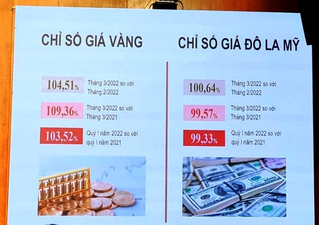 Trong nước, nhu cầu mua sắm vàng gia tăng làm chỉ số giá vàng tháng 3/2022 tăng 4,51% so với tháng trước; tăng 9,36% so với cùng kỳ năm trước; bình quân quý I năm 2022, chỉ số giá vàng trong nước tăng 3,52%.