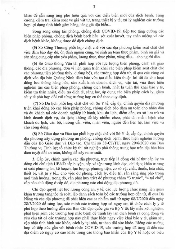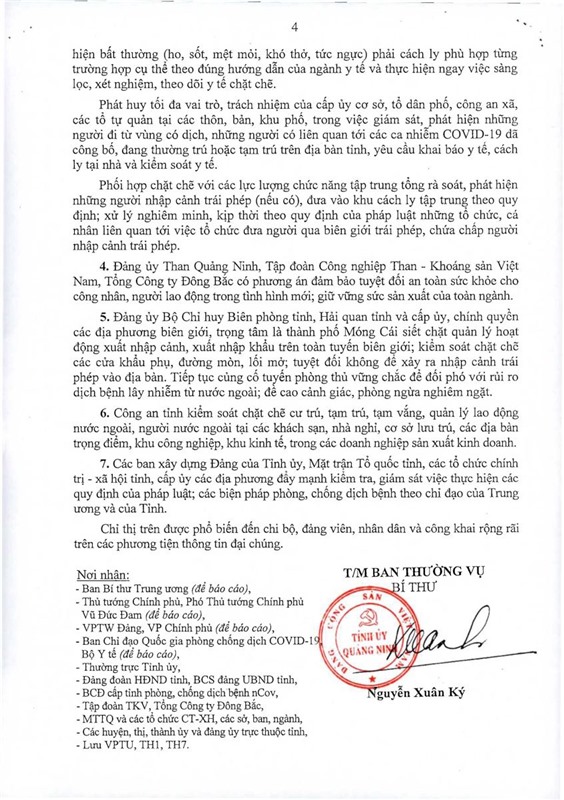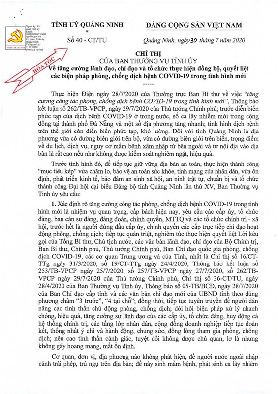 Ngày 30/7, Ban Thường vụ Tỉnh ủy Quảng Ninh ban hành Chỉ thị số 40/CT-TU về tăng cường lãnh đạo, chỉ đạo và tổ chức thực hiện đồng bộ, quyết liệt các biện pháp phòng, chống dịch bệnh COVID-19 trong tình hình mới.