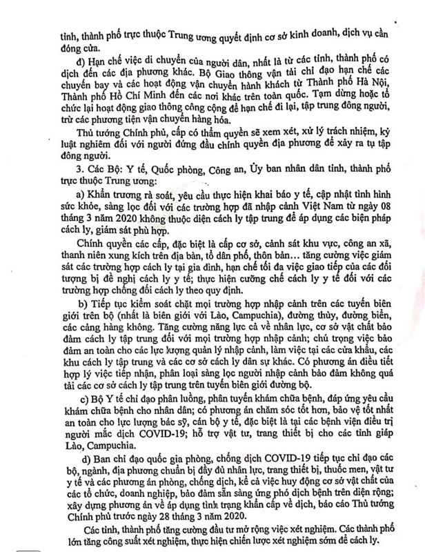 Chỉ thị số 15/CT-TTg ngày 27/3/2020 của Thủ tướng chính phủ về quyết liệt thực hiện đợt cao điểm phòng, chống dịch COVID-19