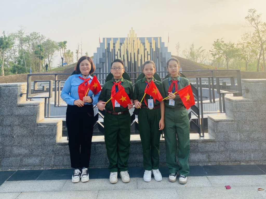 Đinh Thu Trà (thứ 2, phải sang) cùng 2 bạn trong đoàn và cô giáo phụ trách đoàn tham gia Liên hoan "Chiến sĩ nhỏ Điện Biên" toàn quốc lần thứ V - năm 2024. Ảnh: Nhân vật cung cấp.