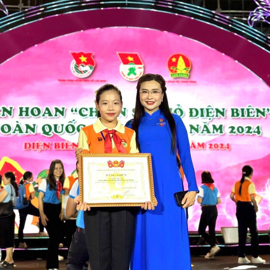 Đinh Thu Trà chụp ảnh lưu niệm cùng Chủ tịch Hội đồng Đội Trung ương trong Liên hoan "Chiến sĩ nhỏ Điện Biên" toàn quốc năm 2024. Ảnh: Nhân vật cung cấp.