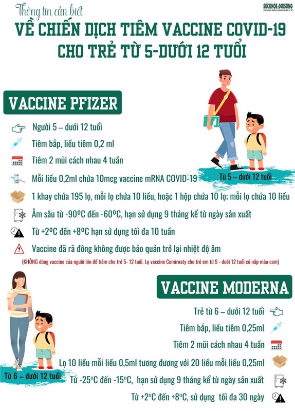 Theo hướng dẫn chính thức của Bộ Y tế mới đây, Việt Nam sẽ tiêm vaccine phòng COVID-19 cho trẻ từ 5 - dưới 12 tuổi bằng 2 loại vaccine là Pfizer và Moderna. Hướng dẫn này cũng lưu ý trẻ được chỉ định tiêm 2 mũi vaccine cùng loại, không tiêm trộn với bất kỳ vaccine mRNA nào.
