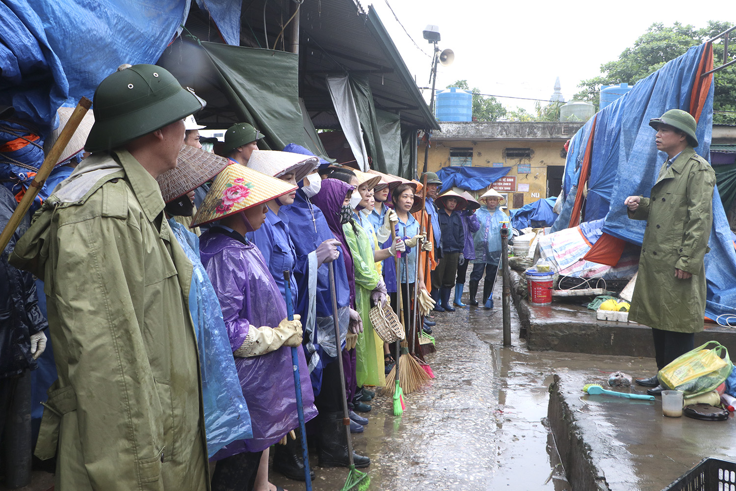 Tập thể lãnh đạo, nhân viên triển khai công tác vệ sinh chợ.