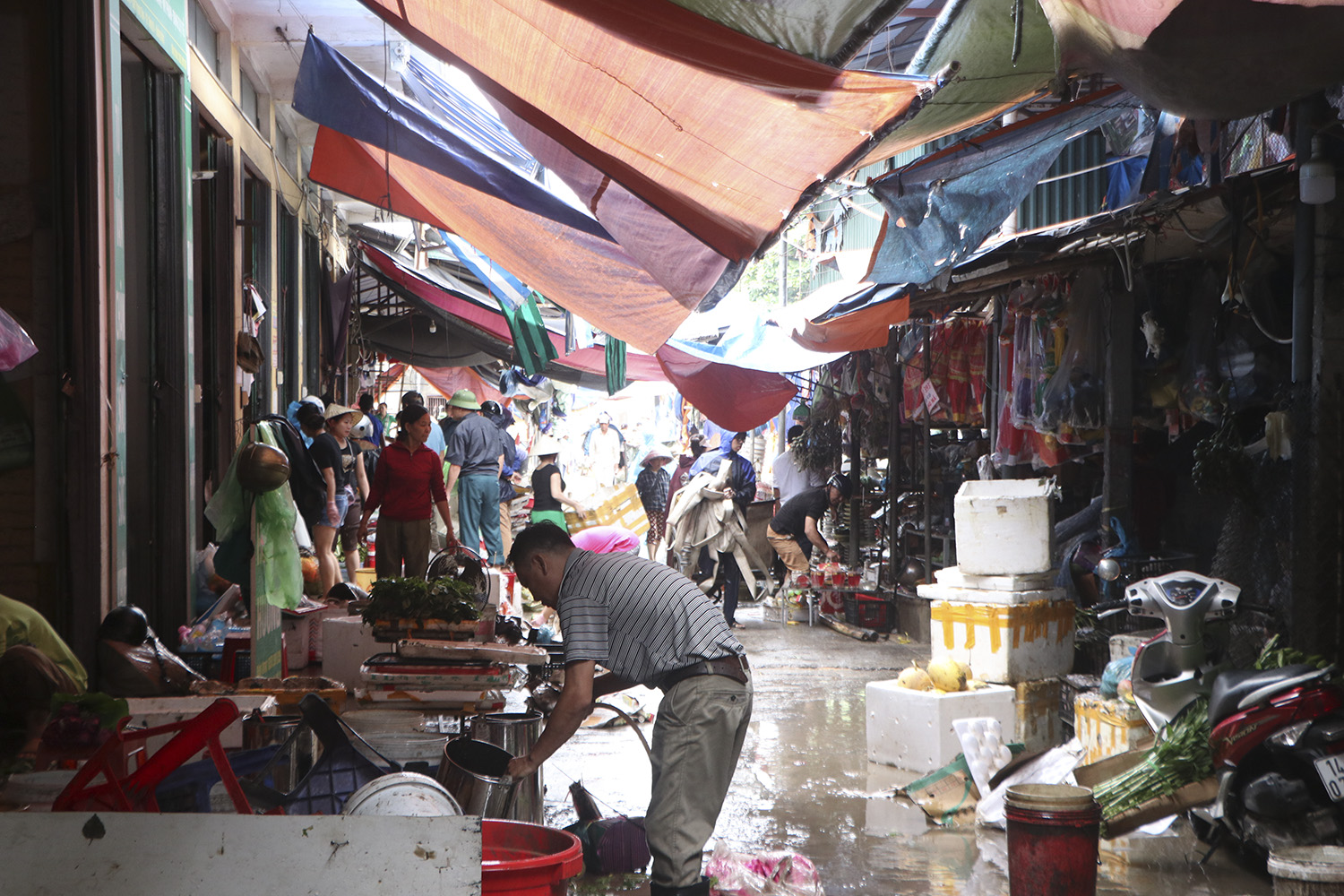 Mặc dù các hộ kinh doanh đã cố gắng hết sức để sơ tán, kê cao hàng hoá, song do lượng mưa lớn nước tràn vào chợ quá nhanh nên nhiều quầy hàng bị ngập trong nước.