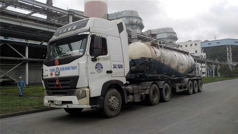 Tro xỉ của Công ty CP Nhiệt điện Quảng Ninh được các đơn vị nhà thầu vận chuyển bằng xe bồn kín, chuyển đến các đơn vị thu mua phục vụ tái sản xuất. Ảnh: Hoàng Nga
