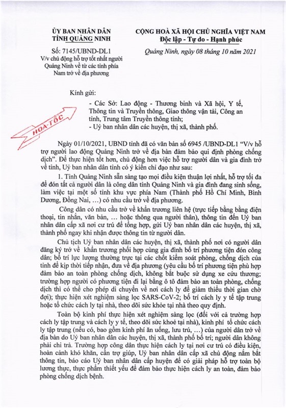 Mới đây, Ủy ban nhân dân tỉnh Quảng Ninh ban hành văn bản số 7145/UBND-DL1 để chủ động hỗ trợ tốt nhất người Quảng Ninh về từ các tỉnh phía Nam trở về địa phương.