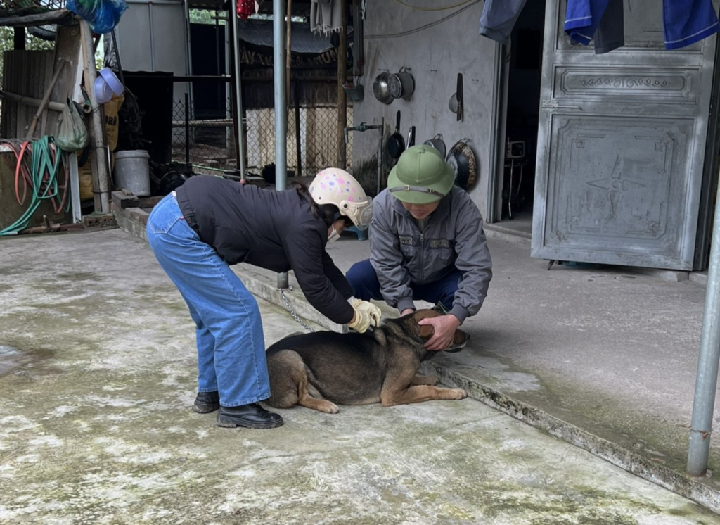 Cán bộ Thú y xã Dực Yên, huyện Đầm Hà, tiêm vắc -xin phòng dại cho đàn chó trên địa bàn.