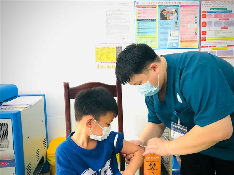 Bác sĩ Trung tâm Y tế huyện Bình Liêu tiêm phòng vắc-xin cho trẻ em.