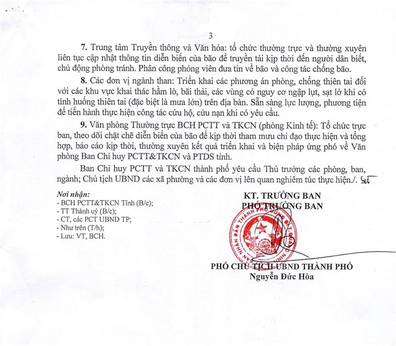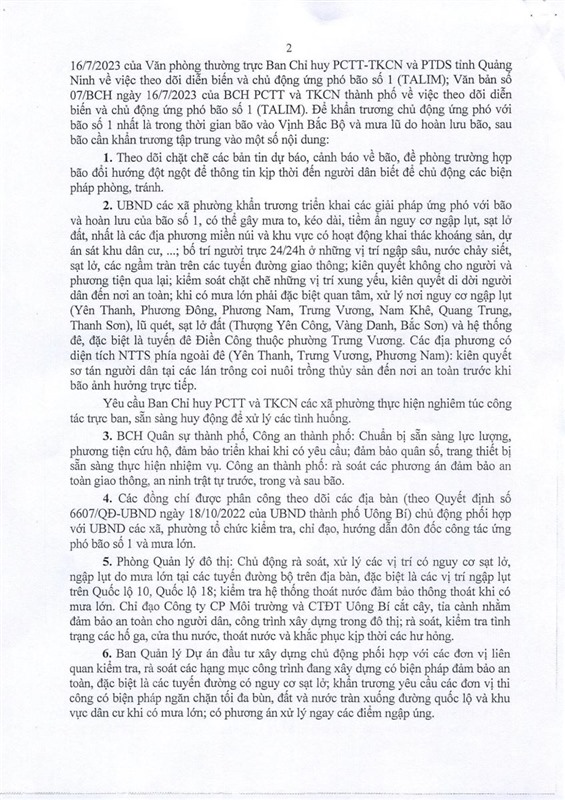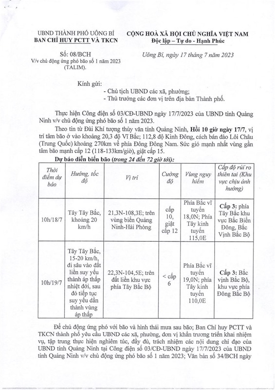 Ngày 17-7, Ban Chỉ huy PCTT và TKCN thành phố ban hành văn bản số 08/BCH về việc chủ động ứng phó bão số 1 năm 2023 (TALIM).