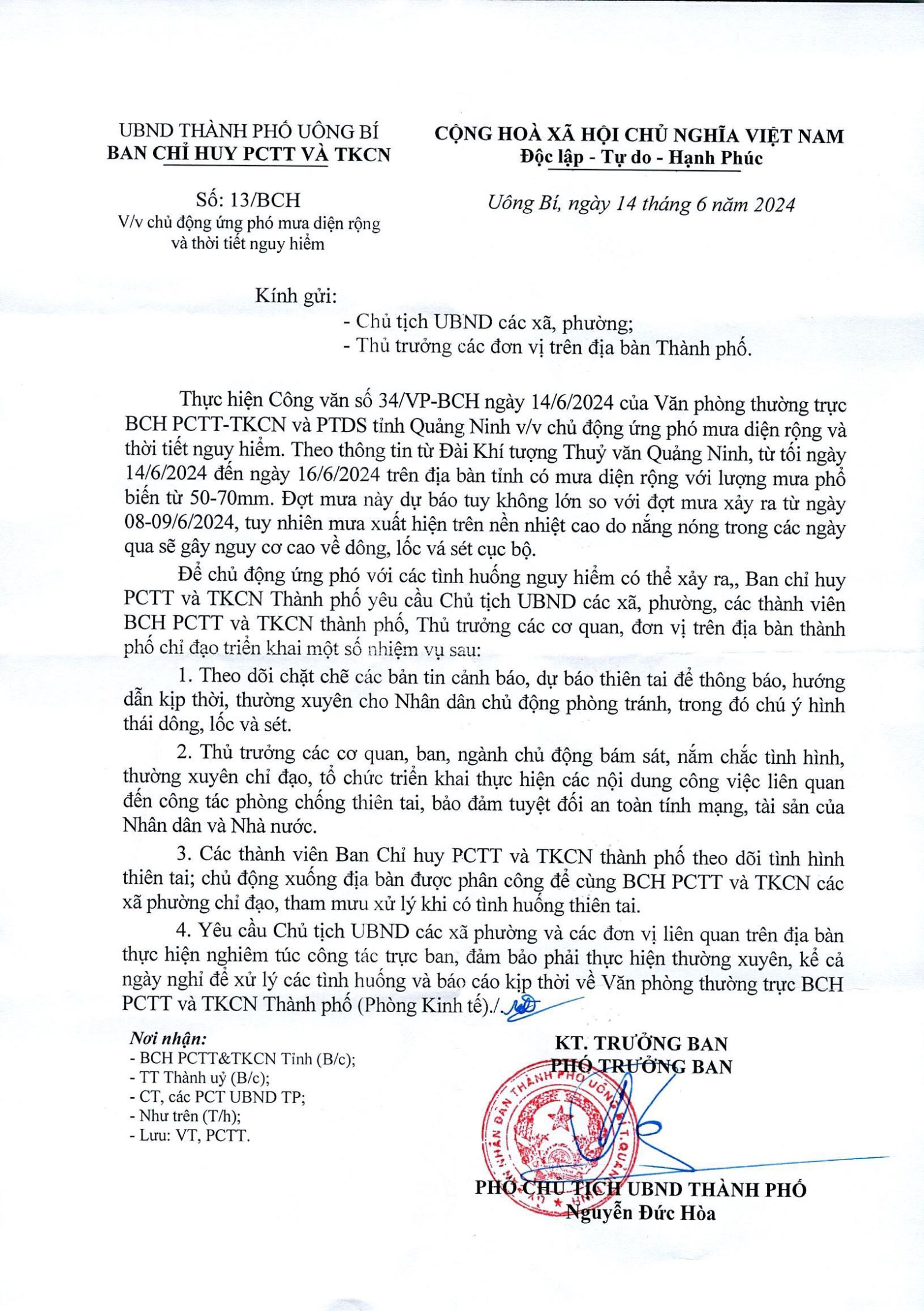 Công văn số 13/BCH ngày 14/6/2024 của Ban Chỉ huy PCTT và TKCN thành phố về việc chủ động ứng phó mưa diện rộng và thời tiết nguy hiểm.