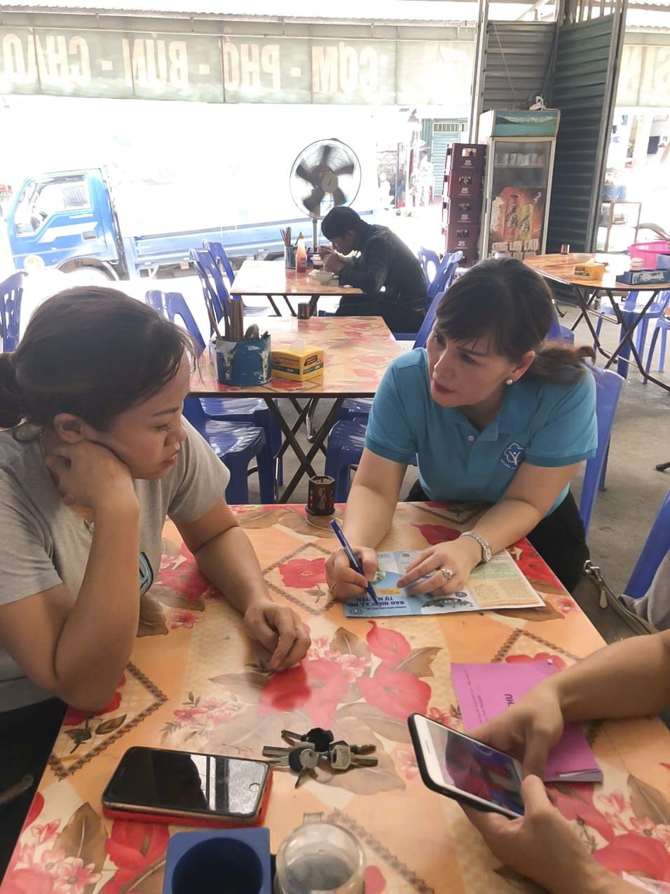 Cán bộ cơ quan BHXH cơ sở Uông Bí tuyên truyền Luật Bảo hiểm xã hội cho chủ hộ kinh doanh cá thể.