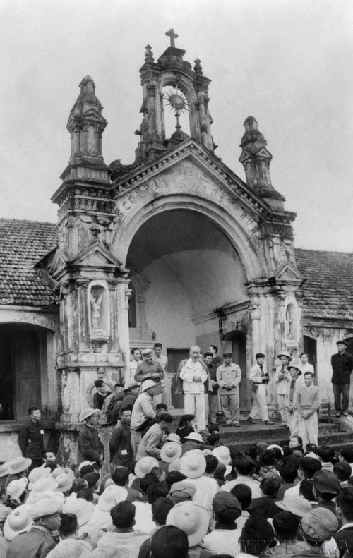 Chủ tịch Hồ Chí Minh về thăm hỏi và nói chuyện với đồng theo đạo Thiên Chúa ở thôn Thạch Bích, xã Bích Hòa, huyện Thanh Oai, Hà Đông (nay là Hà Nội) ngày 5/12/1959. (Ảnh: TTXVN)