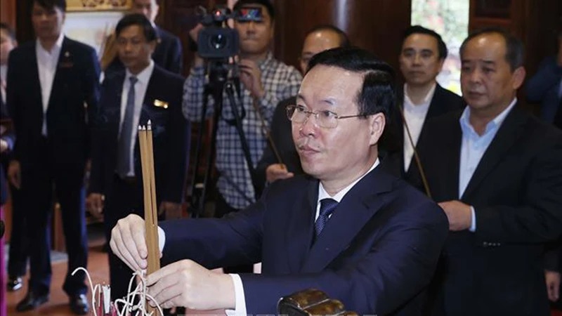Chủ tịch nước Võ Văn Thưởng dâng hương tưởng nhớ Chủ tịch Hồ Chí Minh tại Khu di tích Quốc gia đặc biệt Kim Liên. (Ảnh: TTXVN)