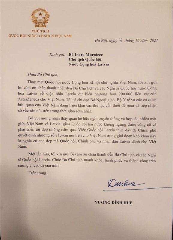 Chủ tịch Quốc hội Vương Đình Huệ vừa gửi Thư cảm ơn Chủ tịch Quốc hội Cộng hoà Latvia Inara Murniece và các nghị sĩ Latvia về việc phía Latvia dự kiến nhượng hơn 200.000 liều vaccine AstraZeneca cho Việt Nam.