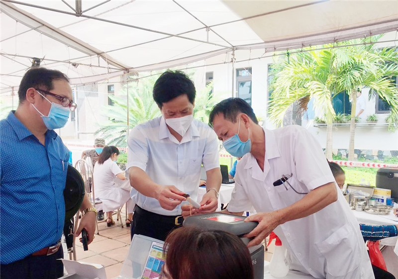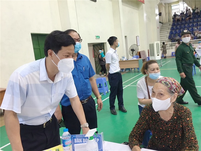 Đồng chí Chủ tịch UBND thành phố ân cần hỏi thăm người dân đến tiêm tại điểm tiêm phường Vàng Danh.