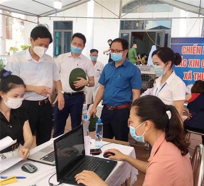 Đồng chí Chủ tịch UBND thành phố kiểm tra công tác nhập dữ liệu tiêm chủng tại điểm tiêm xã Thượng Yên Công.