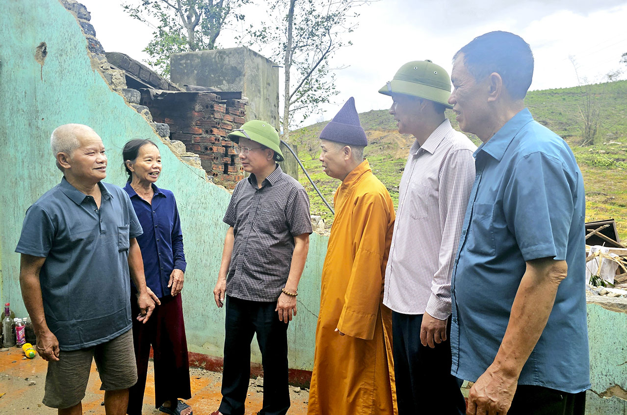 Đồng chí Cao Tường Huy, Phó Bí thư Tỉnh ủy, Chủ tịch UBND tỉnh cùng Thượng tọa Thích Thanh Quyết và Chủ tịch UBND thành phố Uông Bí Phạm Tuấn Đạt thăm hỏi, động viên gia đình ông Lý Văn Minh, thôn Năm Mẫu 2, bị bão cuốn bay mái và sập nhà.