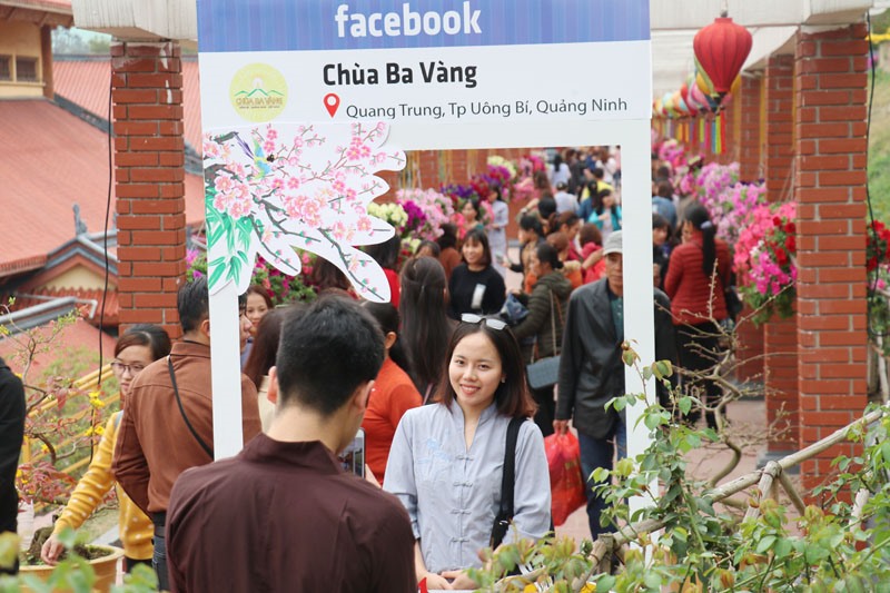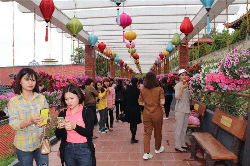 Không gian tươi đẹp của chùa Ba Vàng thu hút du khách tham quan, chụp ảnh.