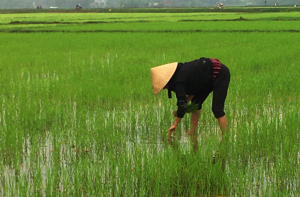Nông dân xã Nguyễn Huệ, TX Đông Triều dặm tỉa lúa mùa.