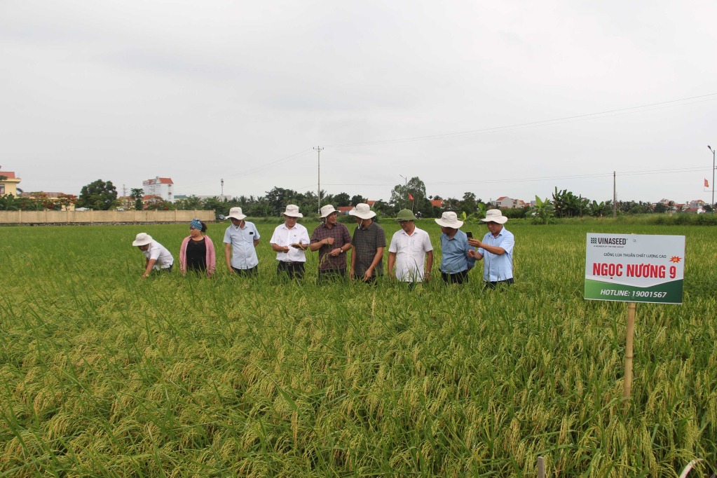 Trung tâm Dịch vụ kỹ thuật nông nghiệp TX Quảng Yên phối hợp với xã Liên Hòa và Công ty Cổ phần Tập đoàn Giống cây trồng Việt Nam khảo nghiệm giống lúa mới chất lượng cao Ngọc Nương 9. Ảnh Thùy Dương - Trung tâm TTVH TX Quảng Yên.