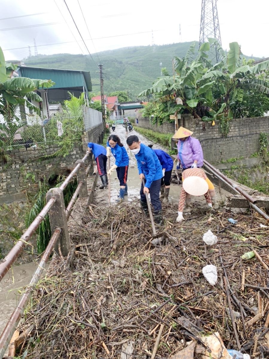 Đoàn viên thanh niên xã Thượng Yên Công tham gia dọn đường giao thông.