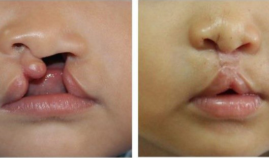 Hình ảnh trẻ trước (hình trái) và sau (hình phải) phẫu thuật dị tật khe hở môi