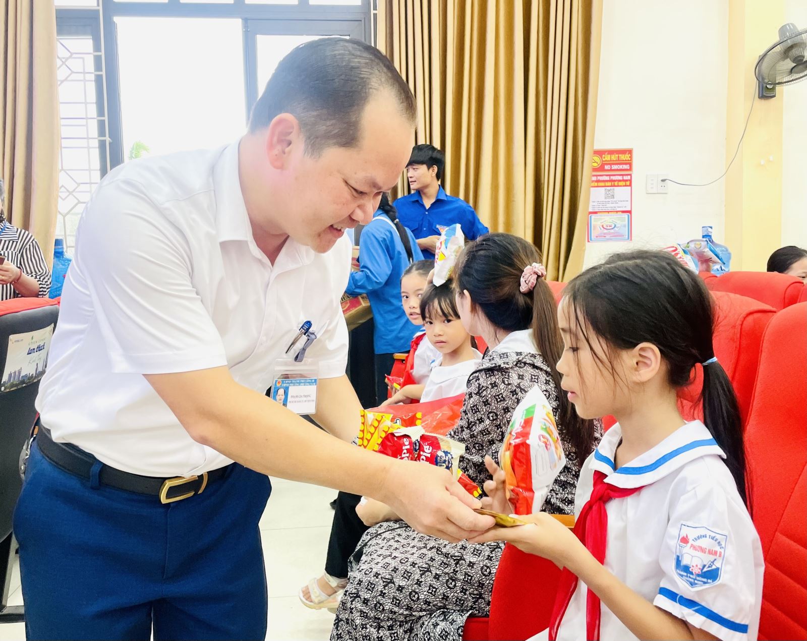 Lãnh đạo phường trao quà cho thiếu nhi có hoàn cảnh khó khăn.