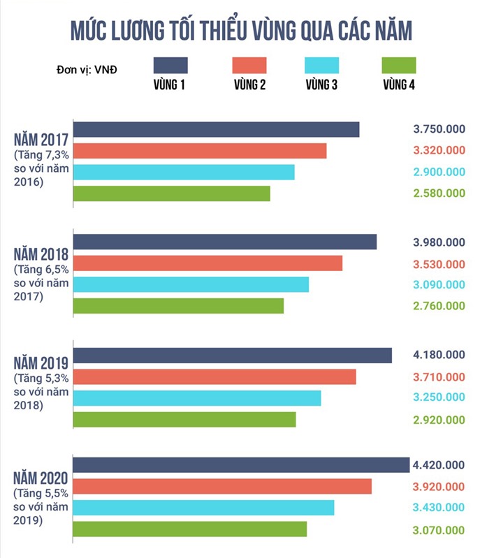 Qua 21 lần điều chỉnh mức lương tối thiểu, từ Nghị định 110/2008/NĐ-CP ngày 10/10/2008 đến Nghị định 38/2022/NĐ-CP ngày 12/6/2022, mức lương tối thiểu vùng I từ 800.000 đồng/tháng lên 4.680.000 đồng/tháng; tương tự như vậy, vùng II từ 740.000 đồng lên 4.160.000 đồng, vùng III từ 690.000 đồng lên 3.640.000 đồng, vùng IV từ 650.000 đông lên 3.250.000 đồng/tháng.