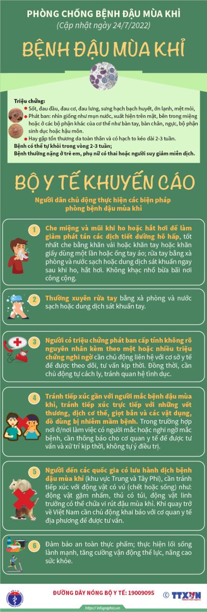 Việt Nam đã triển khai nhiều giải pháp ứng phó với dịch bệnh đậu mùa khỉ đang 'nóng' trên thế giới: - Sáng nay - 26/7, Bộ Y tế họp hội đồng chuyên môn nghiệm thu Hướng dẫn chẩn đoán, điều trị bệnh đậu mùa khỉ; Trước đó, ngay sau khi WHO ban bố tình trạng khẩn cấp y tế toàn cầu về bệnh đậu mùa khỉ, Bộ Y tế họp khẩn vào chiều chủ nhật ngày 24/7 do Thứ trưởng Nguyễn Thị Liên Hương chủ trì với sự tham dự của các Vụ, Cục thuộc Bộ Y tế, Cục Thú y (Bộ NN&PTNT), Sở Y tế một số thành phố lớn, đại diện WHO tại Việt Nam, Trung tâm Kiểm soát bệnh tật Hoa Kỳ đánh giá tình hình dịch bệnh và thống nhất các giải pháp trong thời gian tới; Trước đó nữa, từ tháng 5/2022 (thời điểm ghi nhận sự gia tăng nhanh những ca bệnh tại châu Âu), Bộ Y tế đã có văn bản gửi Ủy ban nhân dân các tỉnh, thành phố về tăng cường giám sát bệnh đậu mùa khỉ; chỉ đạo các Viện Vệ sinh dịch tễ/Pasteur chỉ đạo, hướng dẫn, hỗ trợ địa phương theo dõi, giám sát, xử lý các trường hợp mắc bệnh đậu mùa khỉ; Chuẩn bị sẵn sàng sinh phẩm xét nghiệm phục vụ chuẩn đoán, xác định ca bệnh, các Sở Y tế tăng cường giám sát các trường hợp nghi ngờ ngay tại cửa khẩu, tại các cơ sở y tế và tổ chức truyền thông nâng cao nhận thức cho người dân về tình hình bệnh đậu mùa khỉ và các biện pháp phòng chống tạm thời… |
