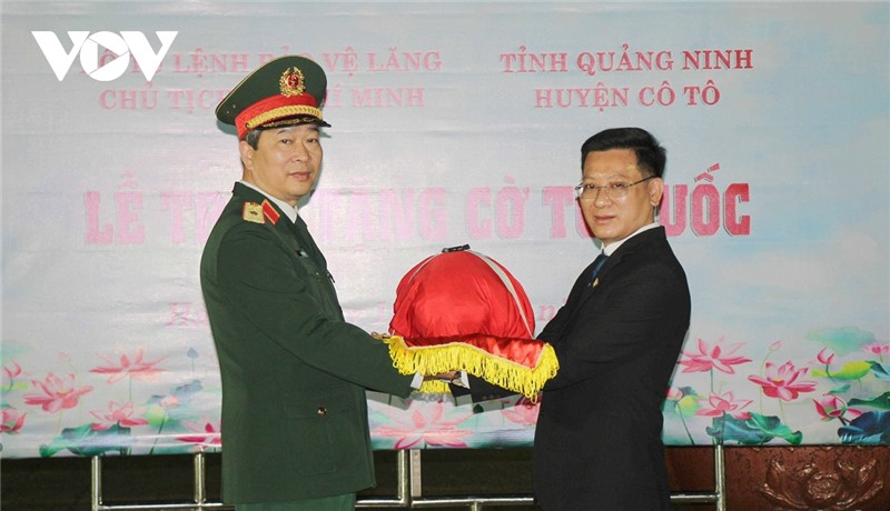 Thiếu tướng Bùi Hải Sơn, Tư lệnh Bộ Tư lệnh Bảo vệ Lăng Chủ tịch Hồ Chí Minh trao tặng lá cờ cho lãnh đạo huyện Cô Tô (Ảnh: Hoàng Phương)