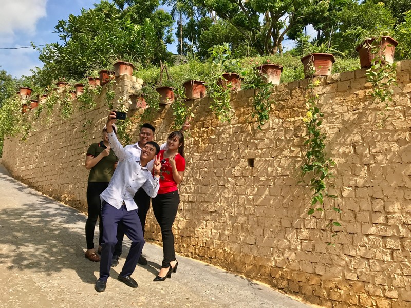 Ngạc nhiên nữa, ngay đầu tuyến đường dẫn vào điểm du lịch, một bức tường giả gốm với những giỏ mai Hoàng Yến buông rủ cổ kính cũng khiến du khách không thể không dừng lại check in.