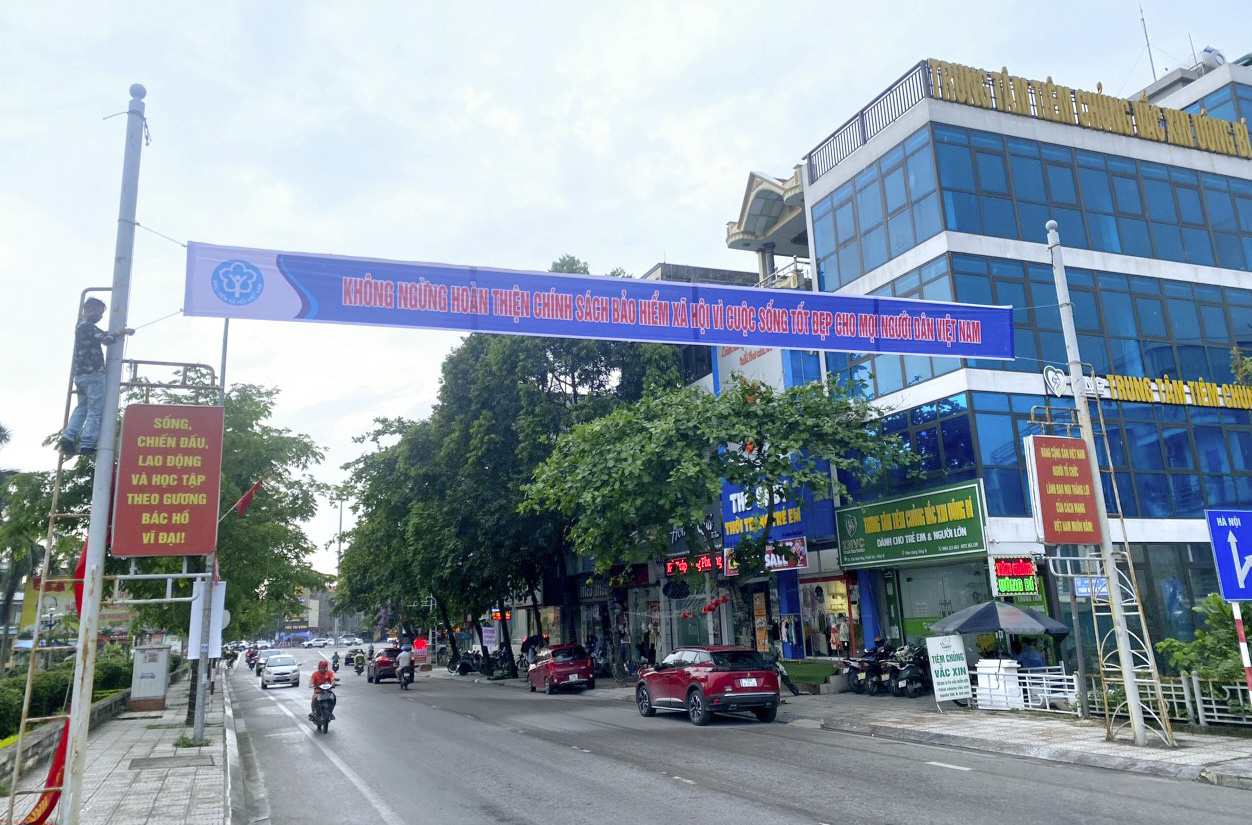 Treo mắc băng rôn tuyên truyền tại các tuyến phố chính.