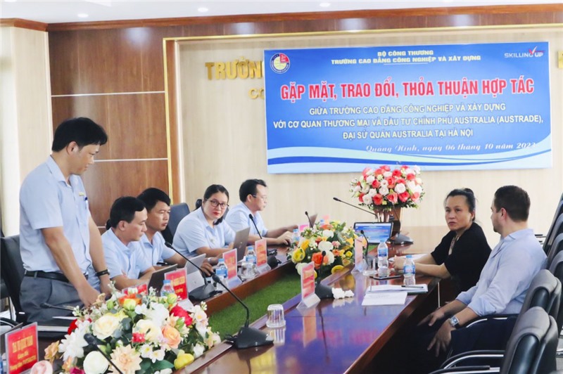 Tại buổi gặp gỡ, TS. Đỗ Minh Chiến, Hiệu trưởng Trường Cao đẳng Công nghiệp và Xây dựng đã giới thiệu về cơ sở vật chất, các ngành nghề đào tạo, đội ngũ cán bộ nhà giáo của nhà trường. Đồng thời, mong muốn và đề xuất với cơ quan Thương mại và Đầu tư Chính phủ Australia một số chương trình hợp tác như liên kết đào tạo; trao đổi sinh viên, giáo viên; study tours; tham dự các hội thảo quốc tế; phương hướng, giải pháp, cơ chế, chính sách kết hợp chặt chẽ trong việc xây dựng chương trình đào tạo gắn với nhu cầu tuyển dụng lao động tại Doanh nghiệp nước ngoài, tạo điều kiện cho các đơn vị trong nhà trường được tiếp cận với thực tế nhu cầu đào tạo và tuyển dụng tại các doanh nghiệp trong và ngoài nước.