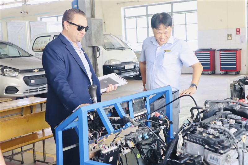 Ngài Chris Morley, Tham tán Thương mại và Đầu tư Australia, đại sứ quán Australia tại Hà Nội tham quan và trải nghiệm một số nghề đào tạo của nhà trường.