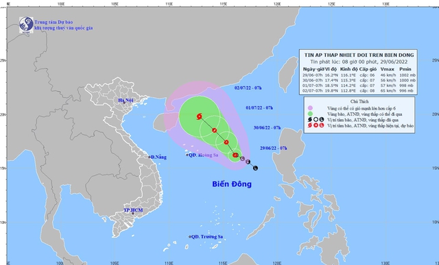 Dự báo trong 24 giờ tới, áp thấp nhiệt đới di chuyển theo hướng Tây Bắc, mỗi giờ đi được 5-10km và có xu hướng mạnh thêm. Đến 07 giờ ngày 30/6, vị trí tâm áp thấp nhiệt đới ở khoảng 17,4 độ Vĩ Bắc; 115,3 độ Kinh Đông, cách quần đảo Hoàng Sa khoảng 410km về phía Đông. Sức gió mạnh nhất vùng gần tâm áp thấp nhiệt đới mạnh cấp 6-7 (40-60km/giờ), giật cấp 9.