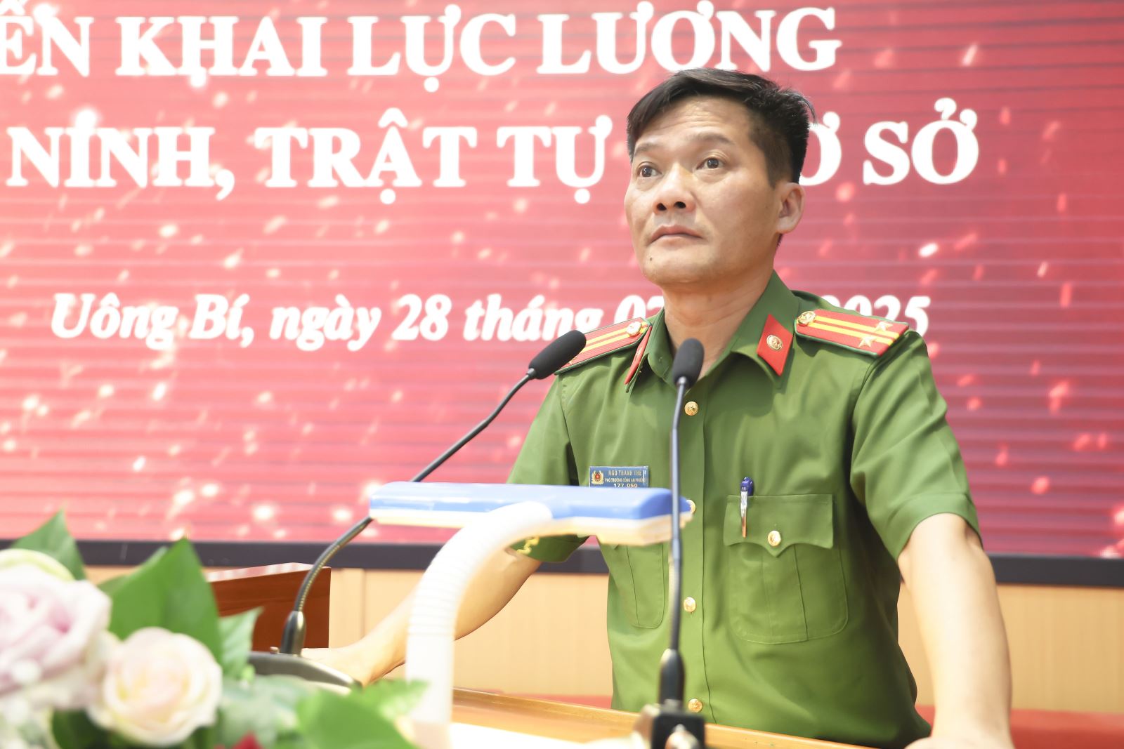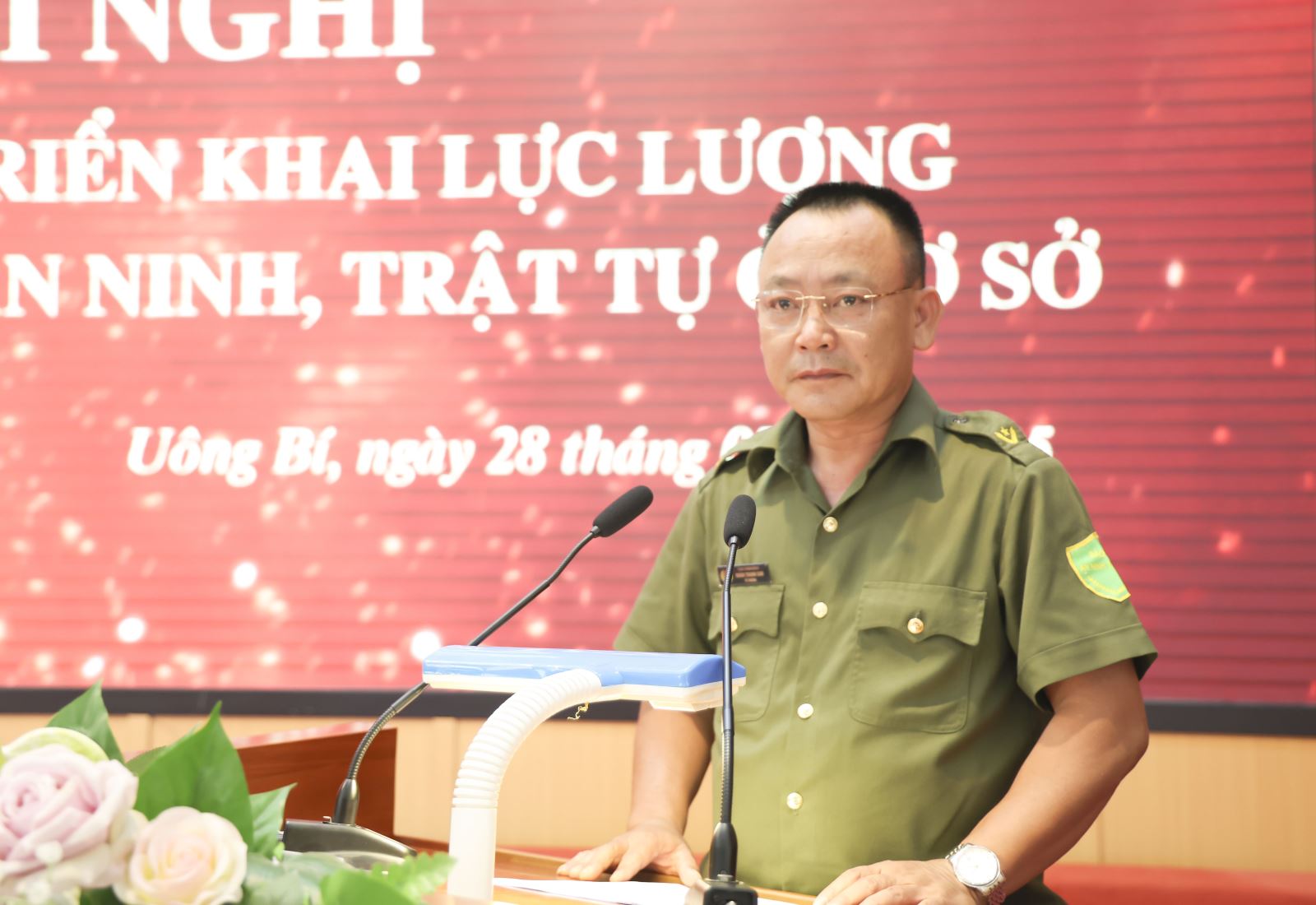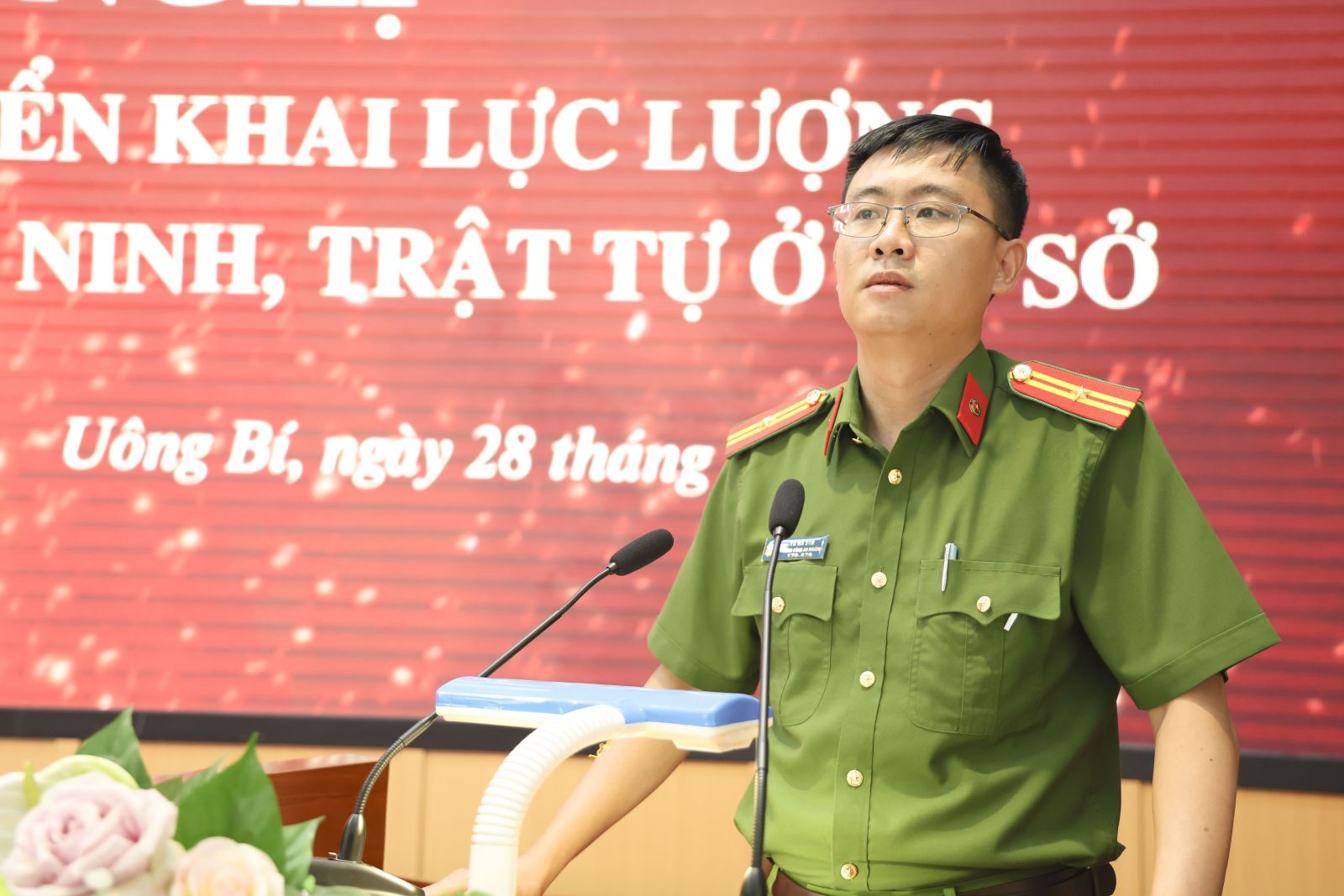 Trung tá Ngô Thanh Thế, Phó Trưởng Công an phường Uông Bí trình bày báo cáo sơ kết 1 năm triển khai lực lượng tham gia bảo vệ an ninh, trật tự ở cơ sở.