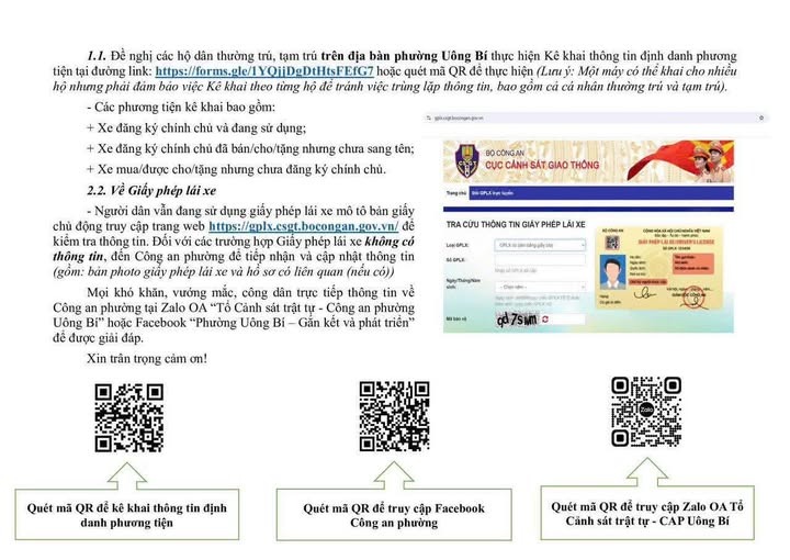 Công an phường tăng cường công tác tuyên truyền, thông tin đến từng tổ dân phố, từng hộ dân về chủ trương tổng rà soát, làm sạch dữ liệu đăng ký phương tiện, giấy phép lái xe của Bộ Công an; Hướng dẫn người dân chủ động đến Công an phường để được hỗ trợ đăng ký định danh, sang tên, đổi chủ đối với các phương tiện chưa cập nhật thông tin chính xác.